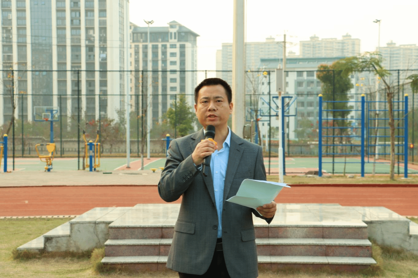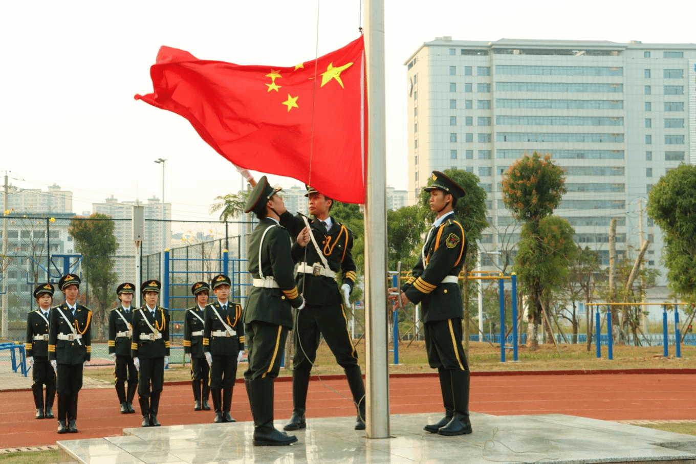 清晨,阳光穿透云层倾洒而下。国旗护卫队迈着整齐有力的步伐,护送五星红旗走向升旗台。伴随着《义勇军进行曲》旋律,全体师生庄严肃立,面向国旗行注目礼,五星红旗在激昂的旋律中缓缓升起。