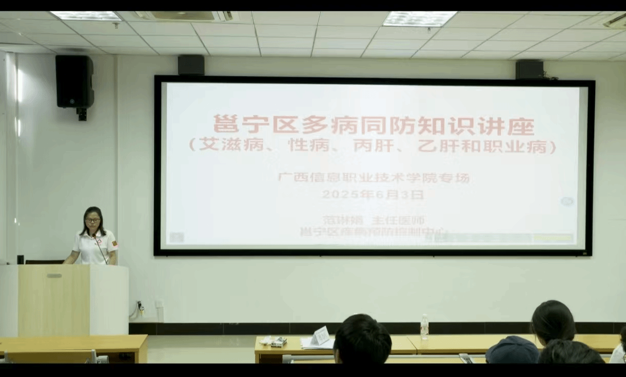 南宁市邕宁区疾病预防控制中心主任医师范琳娟作主题为“要想爱,先懂艾”传染病预防知识讲座。范琳娟结合当下艾滋病防控的严峻形势,通俗易懂地介绍了艾滋病的传播途径、预防方法以及对个人和社会的危害。她提醒,艾滋病防控关键在于提高公众的认知与自我防护意识。讲座过程中,范琳娟还与现场师生积极互动,耐心解答大家提出的疑问,帮助师生们加深对传染病预防知识的理解。