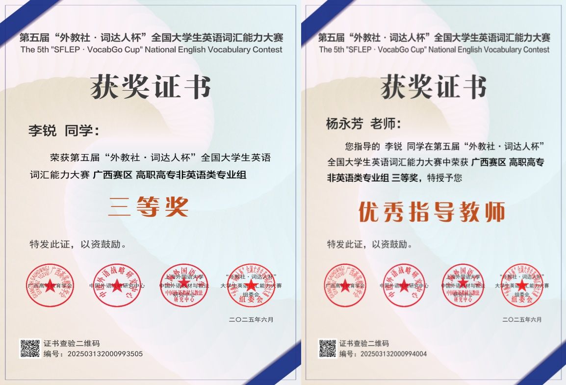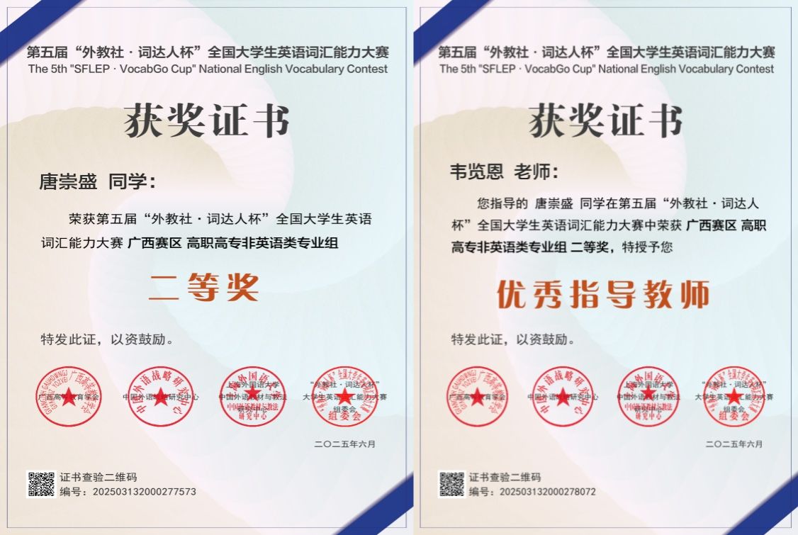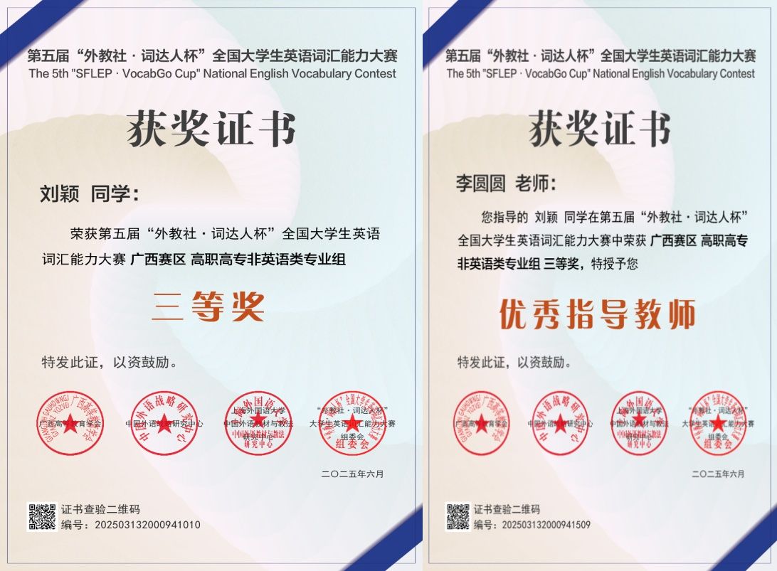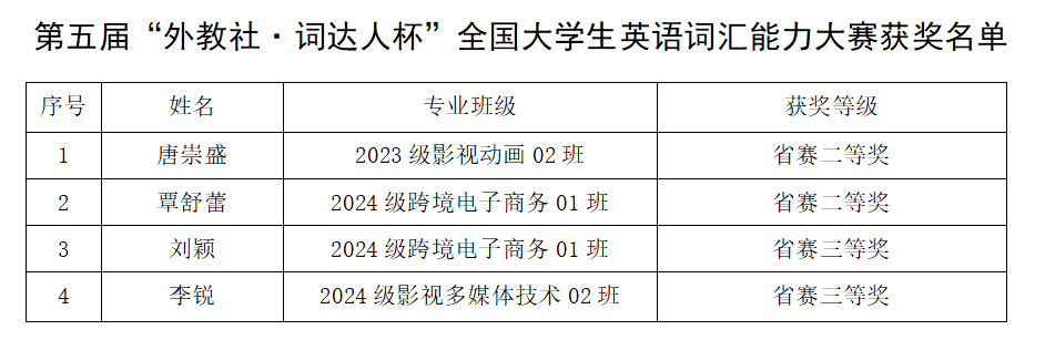 通识教育学院 冯颖 报道 近日,第五届“外教社·词达人杯”全国大学生英语词汇能力大赛落下帷幕。星空网页版登录入口4名学生在高职高专非英语类专业组荣获佳绩,2人获省赛二等奖、2人获省赛三等奖。