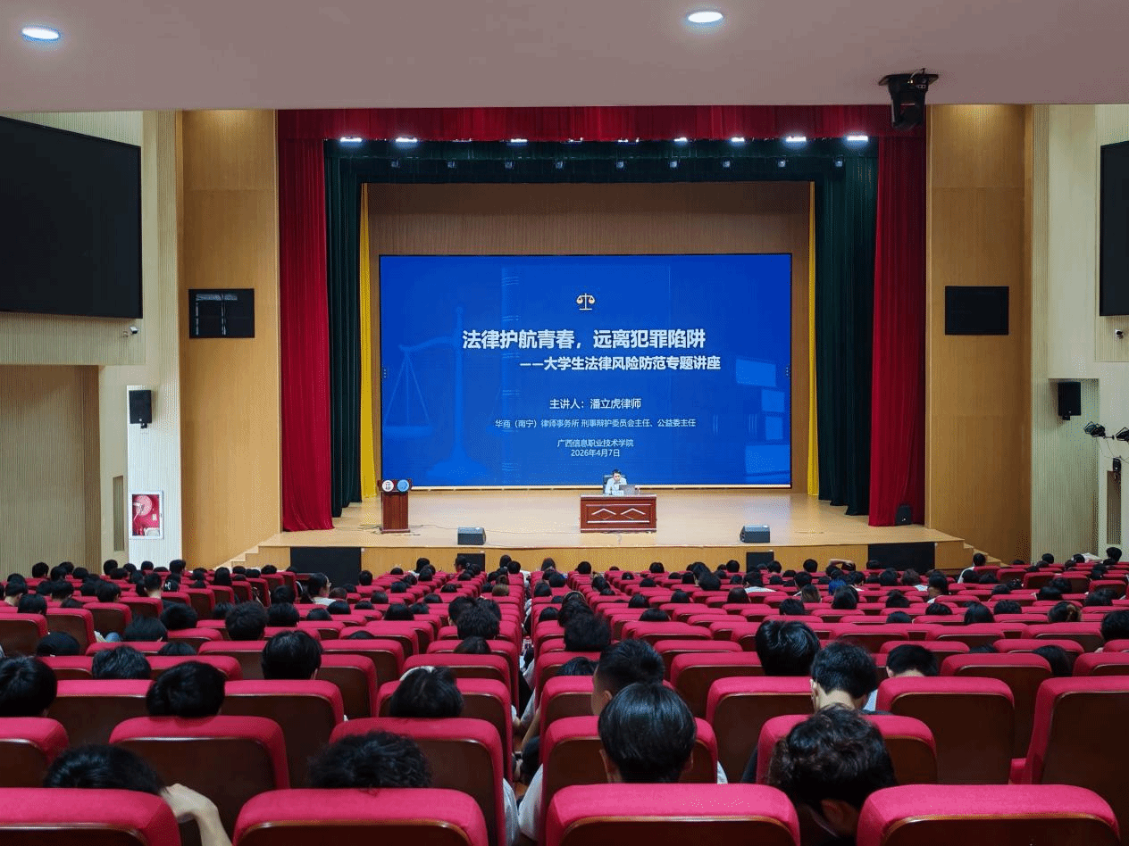 讲座特邀广东华商(南宁)律师事务所潘立虎律师主讲。潘律师结合丰富执业经验,围绕校园及社会生活中的电信诈骗、帮信罪、盗窃、故意伤害、正当防卫及治安管理处罚等常见法律风险与热点问题,以案释法、深入浅出,引导同学们树立正确法治观念,学会运用法律维护自身合法权益,远离违法犯罪陷阱。
