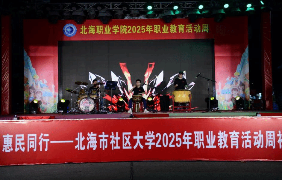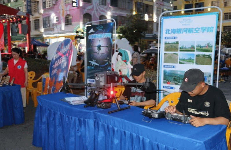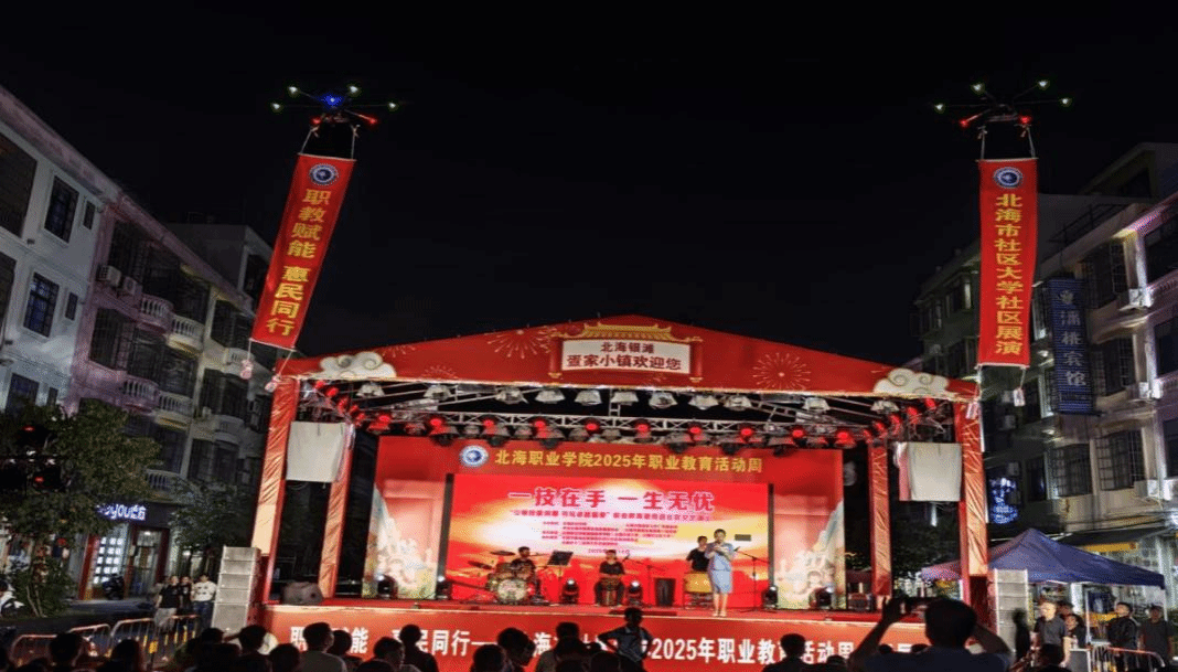 北海开放大学 黄春媚 报道 当夜幕降临北海市疍家小镇,300 余名居民翘首以盼的科技盛宴准时启幕。5 月 14 日晚,由北海市社区大学承办的北海职业学院2025年职教周系列活动之“职教赋能、惠民同行”社区技能展演,以一场震撼人心的无人机编队光影秀拉开帷幕。这次活动不仅是职业教育成果的集中展示,更是校社联动赋能社区发展的生动实践。