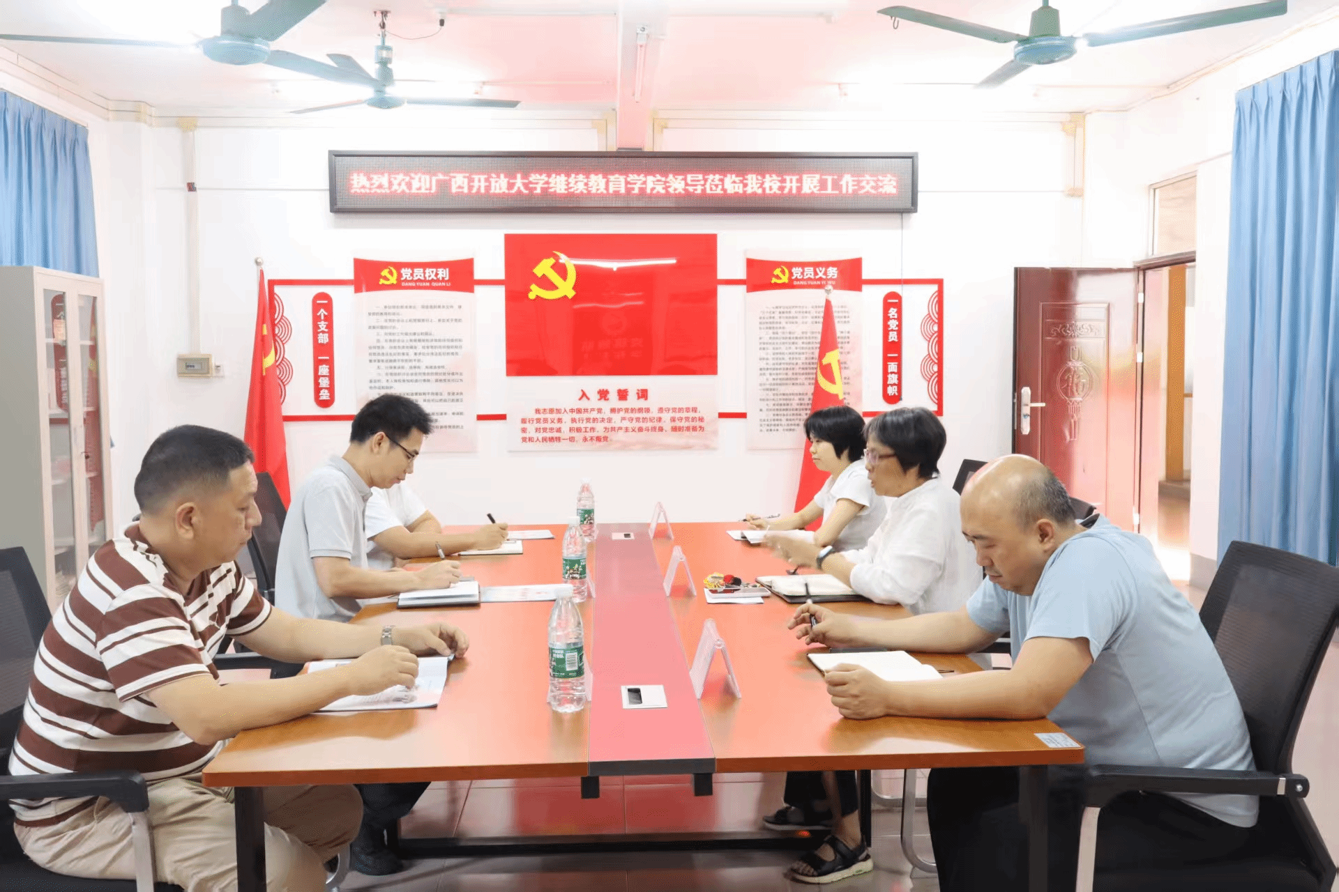 梧州开放大学 黎文华 报道 5月22日下午,星空网页版登录入口继续教育学院副院长黎富贵一行三人到梧州开放大学开展村“两委”中专学历提升项目、高等学历继续教育、同等学力申硕项目合作和经验交流。