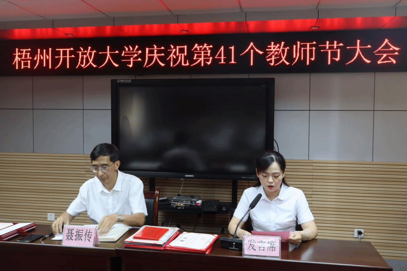 在梧州开放大学庆祝第41个教师节大会上,学校党总支书记、校长聂振传代表学校向全体教职工和社区教育教师致以节日的问候和崇高的敬意,充分肯定大家在教育教学、学员管理服务、校园建设等工作中付出的努力,勉励全体教师要始终以立德树人为根本,既要传承优秀的办学传统,又要勇于创新突破,以教育家精神铸魂强师,推动梧州开大教育事业再上新台阶。党总支副书记唐赟向在场全体教职工宣读梧州市委、市政府《致全市广大教师和教育工作者的一封信》,向全校辛勤耕耘在教育战线上的广大教师、教育工作者致以节日的祝贺和真挚的祝福。
