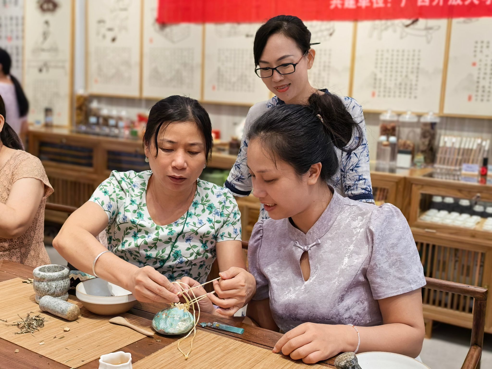 活动尾声,学员们纷纷完成并展示自己制作的药香清雅驱蚊香囊,脸上洋溢着喜悦与成就感。志愿者们用镜头为每一位学员记录下精彩瞬间,还协助整理工具、清理场地,协助活动圆满收官。