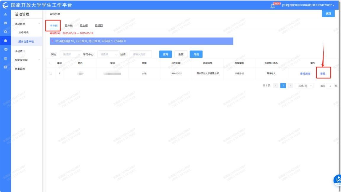 1.活动管理——报名信息审核——查询活动——点击“去审核”。
