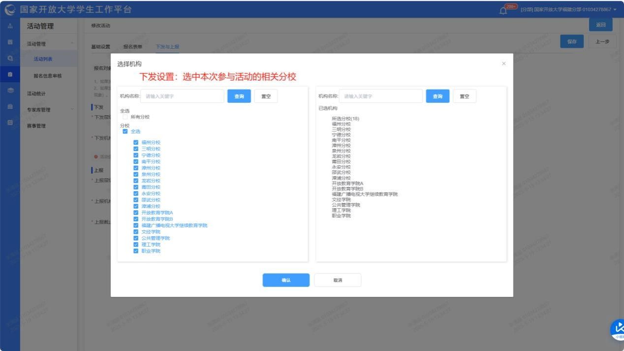 所有层级需通过系统用户管理为下一层级设定活动大赛管理员权限,教师工号可通过建立QQ群等方式获取。严格遵循“总部→分部(学院)→分校→学习中心”的活动下发流程,以及“学习中心→学院→分校(学院)→总部”的作品上报流程,确保各环节按活动时间截点完成操作。