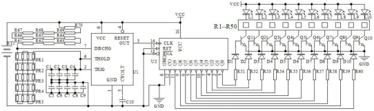 贴片元件焊接以后,通电形成流水灯,检测焊接的效果。刚通电时由于电容C1-C9两端电压不能突变,NE555的2脚处于低电平输出端3脚呈高电平,当电源经R61-R70、RP1-PR5向C1-C9充电到2/3电源电压时,输出端3脚电平由高变低,NE555内部放电导通,电容C1-C9经555的7脚放电,直到C1-C9两端电压低于1/3电源电压时,555的3脚电平又由低电平变成高电平,C1-C9再次充电,如此形成循环震荡。改变RP1-RP5的大小可以改变振荡器的输出频率,555时钟震荡信号不断地加在4017的14脚,在4017的10个输出端接有10个三极管驱动10个LED,4017的10个输出端在时钟信号的作用下轮流产生高电平,则L1-L10一次被点亮,形成流水灯的效果。