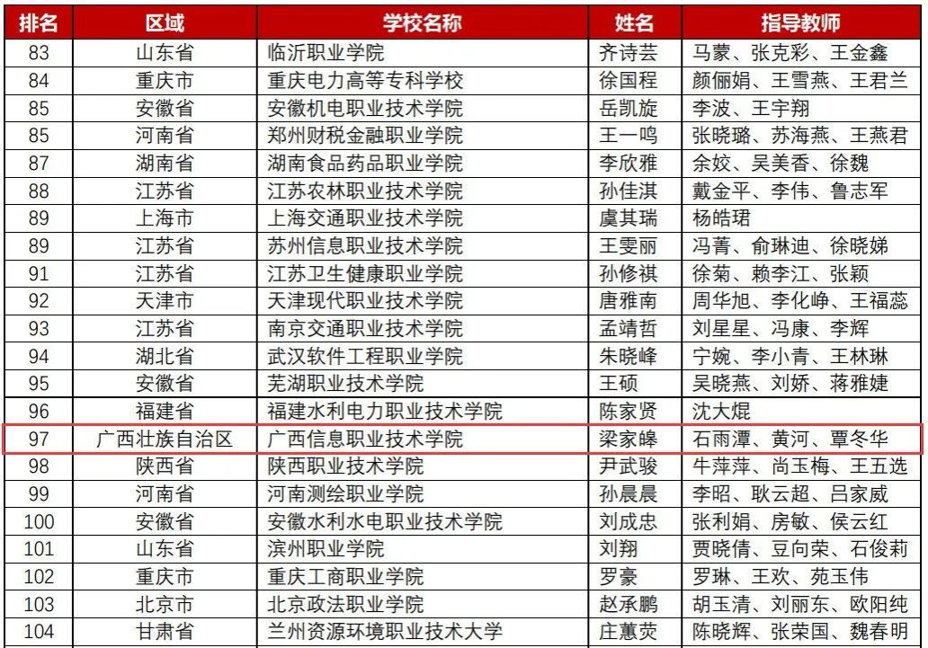 近日,2023年第五届全国高职高专院校信息素养大赛全国决赛圆满落下帷幕,广西信息职业技术学院互联网科技学院2022级大数据技术专业5班梁家皞同学以优异的成绩荣获全国决赛三等奖(指导教师:石雨潭、黄河、覃冬华),成为广西唯一获奖选手。广信学子连续两年作为广西唯一选手代表参加全国决赛第二阶段比赛并获奖,充分展现了学校重视信息素养教育,以现代信息技术为专业发展方向的办学特色。