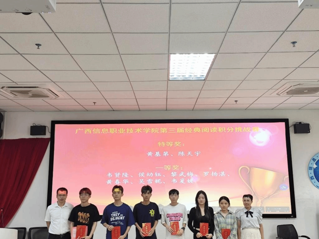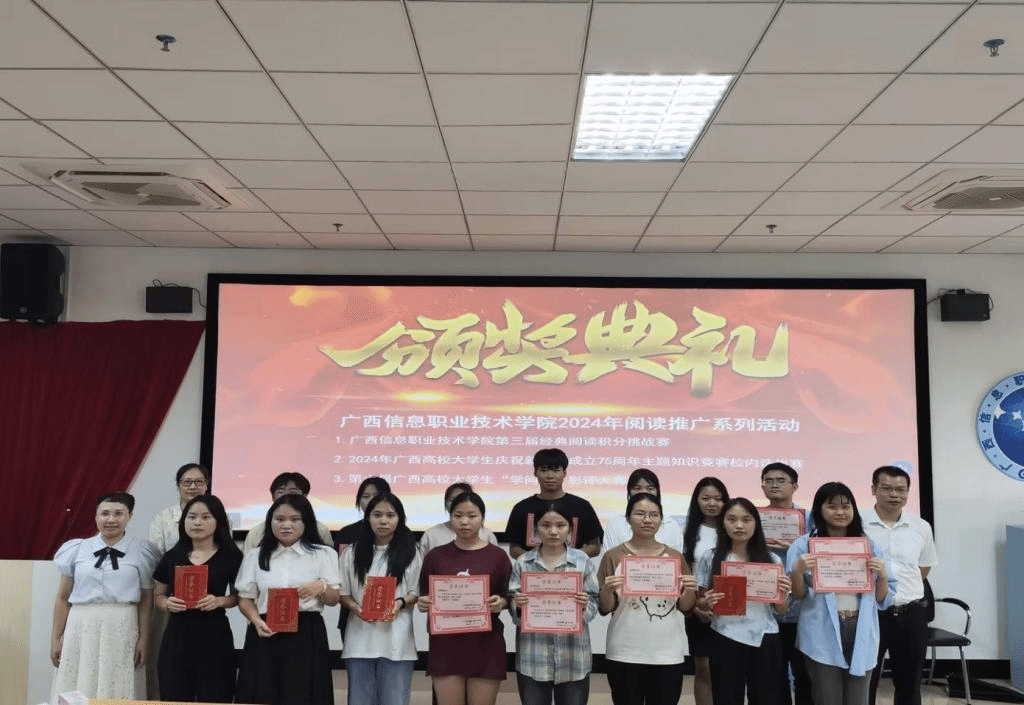 广西信息职业技术学院2024年阅读推广系列活动主要包含三个竞赛活动,分别是第一届广西高校大学生移动阅读活动暨广西信息职业技术学院第三届经典阅读积分挑战赛、2024年广西高校大学生庆祝新中国成立75周年主题知识竞赛、第六届广西高校大学生“学问杯”影评大赛,三个赛事均历时两个多月,经过层层选拔、激烈角逐,取得了优异成绩。在第一届广西高校大学生移动阅读活动暨广西信息职业技术学院第三届经典阅读积分挑战赛中,星空网页版登录入口两名同学在全区高职高专院校组个人赛决赛中获得二等奖、三等奖各一项,星空网页版登录入口评出特等奖2名,一等奖6名,二等奖10名,三等奖39名。在2024年广西高校大学生庆祝新中国成立75周年主题知识竞赛中,星空网页版登录入口两名同学在全区高职高专院校组个人赛中获得优胜奖,校内选拔赛评出特等奖2名,一等奖5名,二等奖8名,三等奖19名,优胜奖37名。在第六届广西高校大学生“学问杯”影评大赛中,星空网页版登录入口1名同学进入全区决赛并获得优秀奖,校内选拔赛评出特等奖1名,一等奖2名,二等奖5名,三等奖9名,优秀奖8名。