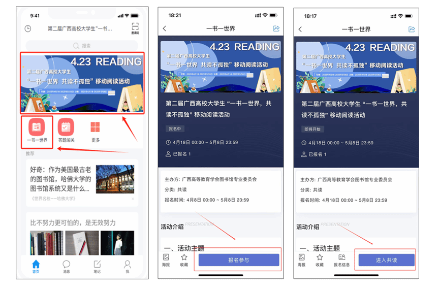②初赛阶段点击首页轮播图或者“一书一世界”模块,右下角点击报名参与按照提示完成报名,返回首页点击右下角进入共读即可参与图书阅读。