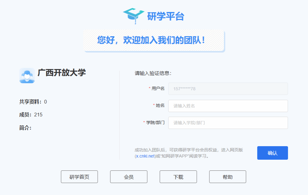 五、为提高资源使用效益,关联用户如长时间不登录、不使用,图书馆将解除关联,使用者需重新申请关联。在平台试用过程中如遇问题或者有意见、建议,请联系本校图书馆:韦武超,0771-2206255,或联系知网研学平台工作人员:包桂萍15723776178。