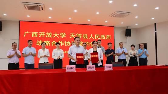 签约仪式上,星空网页版登录入口副校长刘绍英和天等县人民政府副县长甘露丹分别代表双方完成了战略合作协议签署。签约仪式后,星空网页版登录入口校领导、天等县委领导共同为“天等开放大学”揭牌。