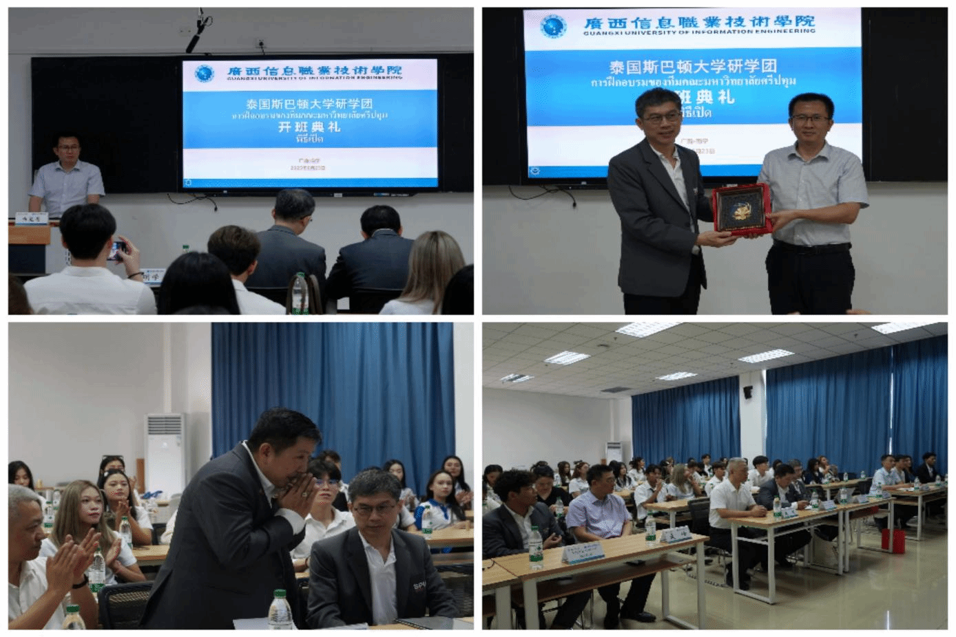 6月23日上午,研学团参观了图书馆、直播电商实训室、工业机器人实训室、空天地一体化实训中心、装饰工程实训室等校园设施,对学校信息专业特色表示高度认可。之后,星空网页版登录入口在鲁班楼举行研学团开班仪式。广西信息职业技术学院副院长黄河、邓明学,泰国东盟企业家协会副主席WACHAROTAYANGKURA TANAN、泰国斯巴顿大学校长助理JANYAPOON SUWAT、广西信息职业技术学院北斗与通信学院、通识教育学院相关负责人等出席了开班仪式。