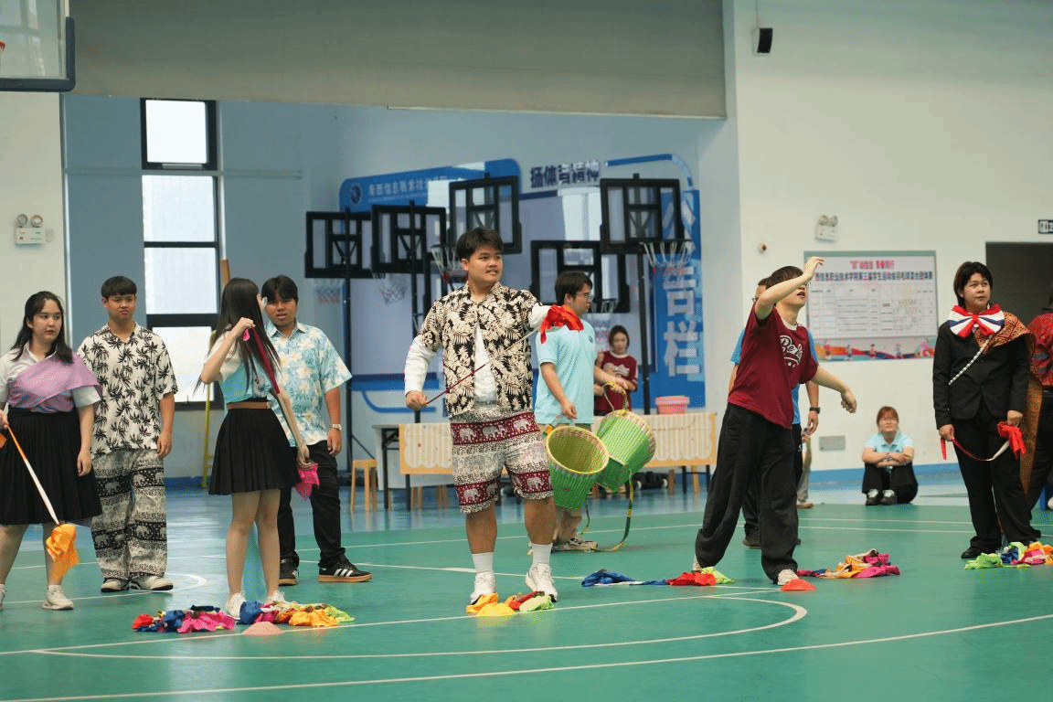 3月24日上午,一场别开生面的文体活动在体育馆三楼举行。竹竿舞、抛绣球、踢毽子等广西传统民族体育项目,让泰国师生沉浸式感受中华文化的独特魅力。中泰学生结对协作,在竹竿起落开合间共舞欢乐,在绣球抛接中传递情谊。即兴舞蹈环节,双方师生围圈共舞,将现场气氛推向高潮,欢声笑语里“中泰一家亲”的情谊愈发深厚。