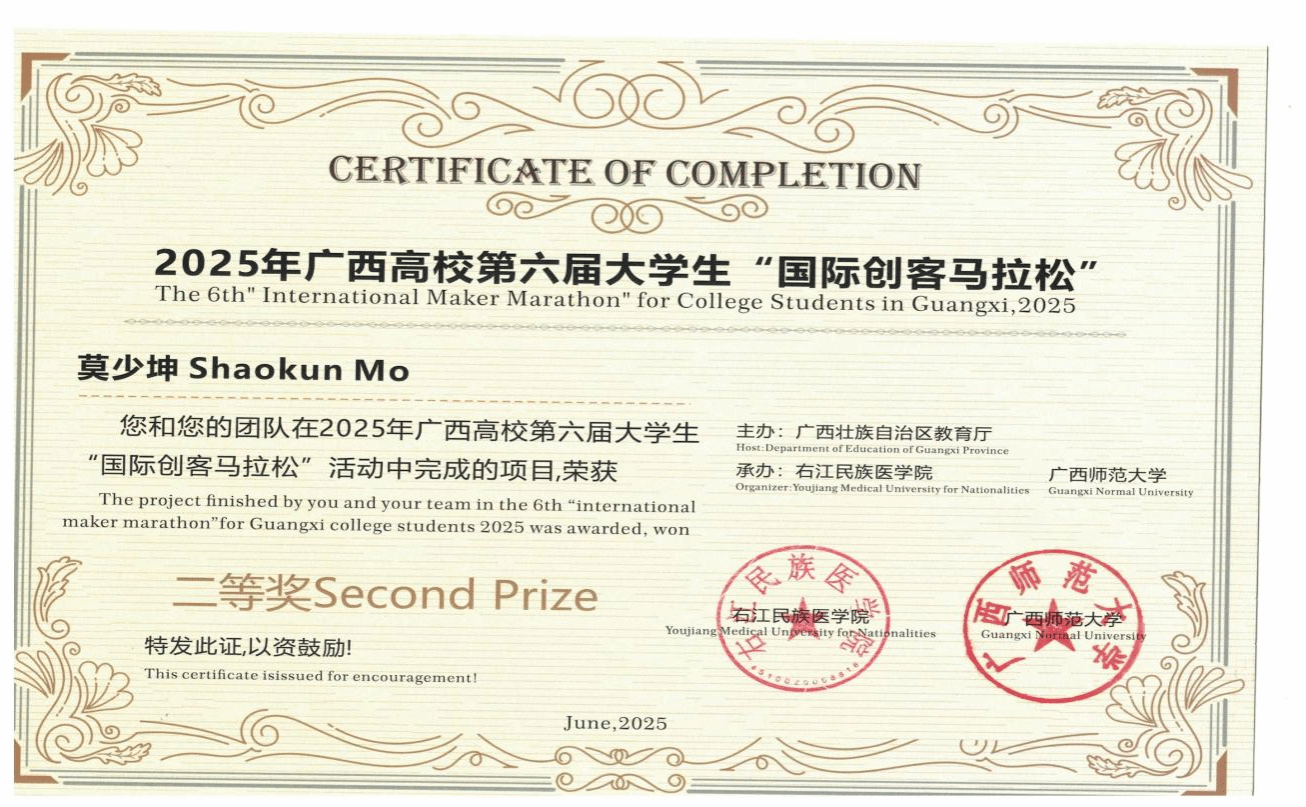 据介绍,“国际创客马拉松”是一项为期32小时的创新挑战赛,以跨校、跨专业组队的形式展开,着力前沿创新思维与实践能力的培养。参赛团队需围绕特定主题,深入挖掘用户需求,快速形成创意方案,并通过原型制作、测试优化及路演展示等环节,全方位锻炼创新素质、创业能力、团队协作与抗压应变能力。莫少坤作为网络营销与直播电商专业的学生,在团队中承担网络宣传、短视频拍摄与制作、脚本撰写、市场定位把控、营销方案设计及路演展示等多重任务,与其他成员组成学科互补的综合型团队。在32小时的攻坚活动中,团队成员克服技术难题、优化创意方案,用“连轴打磨、互相支撑”的协作精神,诠释了“创客精神”内核,展现了星空网页版登录入口学子在跨学科协作与国际交流中的创新活力,展示出星空网页版登录入口在创新创业教育及人才培养方面的成效。