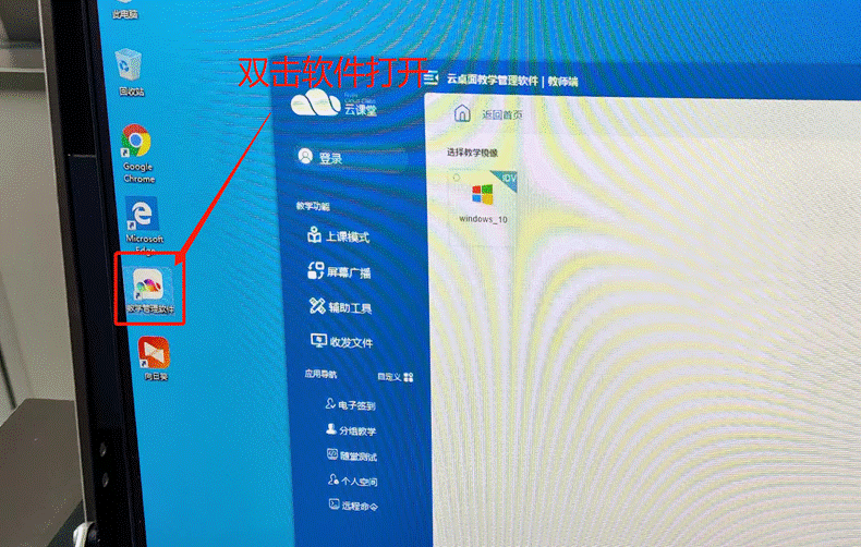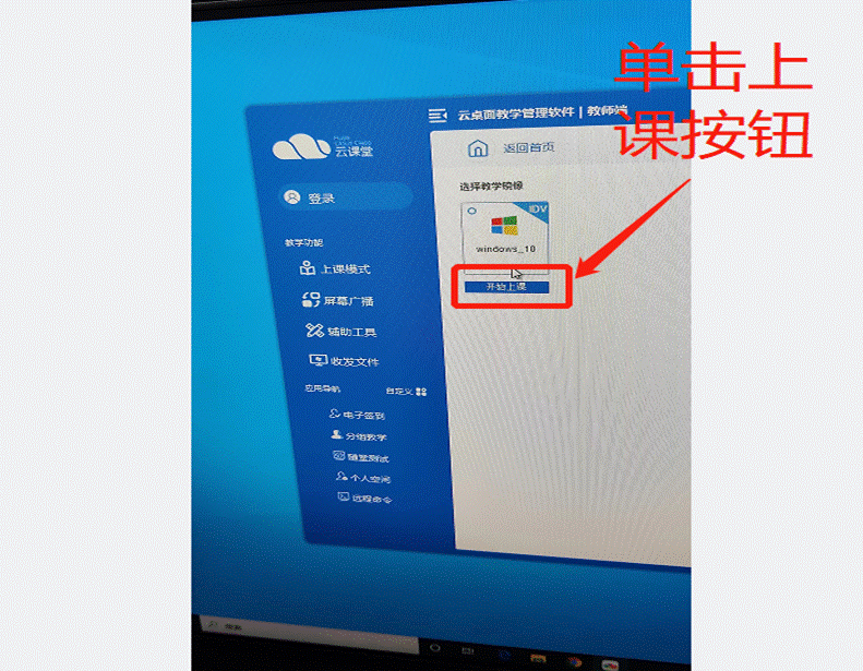 第三步:开启学生终端:通过双击教师桌面的“教学管理软件”进入软件界面,通过选中界面的Windows 10选项,单击上课按钮,开启学生终端电脑。(关闭学生机同理)(如下图)