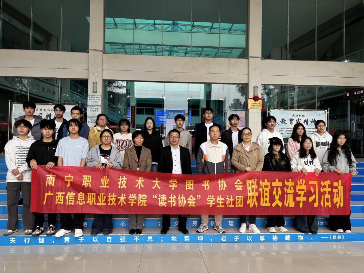 网络与信息中心(图书馆、教育技术中心) 韦武超 报道 为深化馆际合作、共享阅读推广经验,12月23日,学校图书馆联合校读书协会,与南宁职业技术大学图书馆及图书协会开展联谊交流学习活动。两校师生代表齐聚南宁职业技术大学图书馆,以座谈分享、实地观摩、经验互鉴的形式,共话书香校园建设路径。