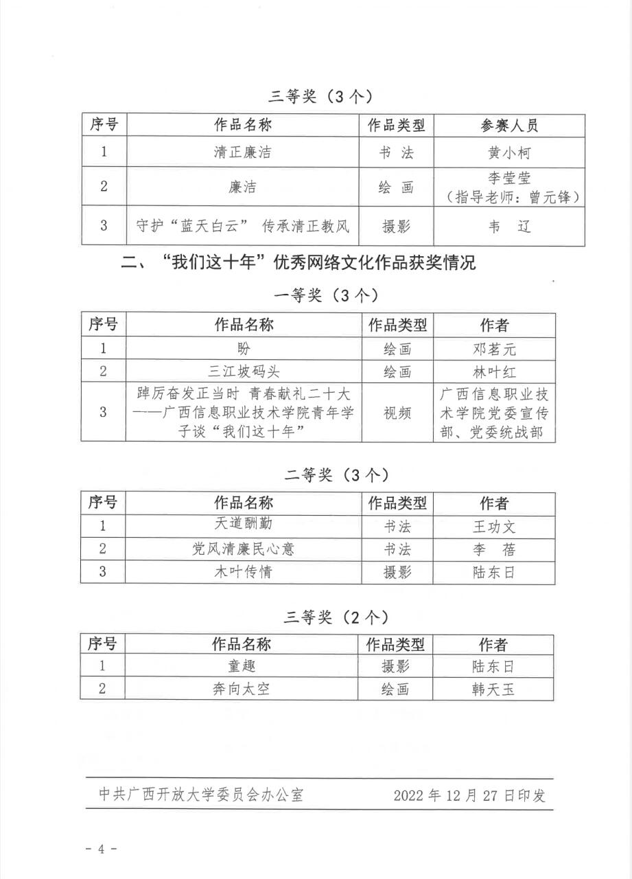 2022年9月至12月,星空网页版登录入口组织开展了2022年全区开放大学清廉文化和“我们这十年”优秀网络文化作品征集活动。按照活动规则,经组织专家评审,共评选出2022年全区开放大学清廉文化作品一等奖5个、二等奖8个、三等奖3个,2022年全区开放大学“我们这十年”优秀网络文化作品一等奖3个、二等奖3个、三等奖2个,现予以公布(名单详见附件)。