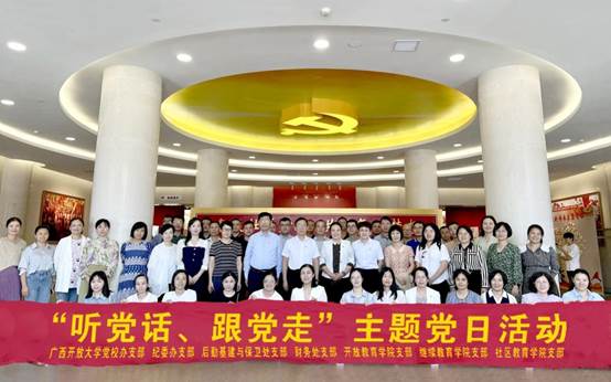 党校办党支部 李婷报道 为大力推进清廉学校建设,激励引导广大党员、干部从党的百年伟大奋斗历程中汲取继续前进的智慧和力量,10月17日下午,党校办党支部、纪委办党支部、后勤基建与保卫处党支部、财务处党支部、开放教育学院党支部、继续教育学院党支部、社区教育学院党支部等50多名党员和入党积极分子,赴广西展览馆联合开展“听党话、跟党走”主题党日活动,校党委书记李卫东、副校长翁洁、原副校长邓艳葵以普通党员身份参加活动。