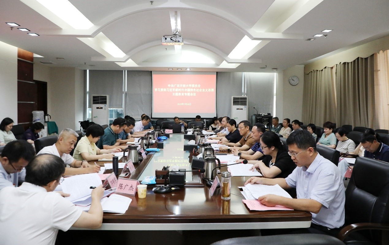 党委宣传部 报道 7月18日上午,学校党委在远教大厦16楼会议室召开学习贯彻习近平新时代中国特色社会主义思想主题教育专题会议。学校领导,广西信息职业技术学院领导,各党总支、直属党支部书记,部门负责人,主题办主任、副主任、各工作组组长、联络员参加会议。会议由学校党委书记李卫东主持。