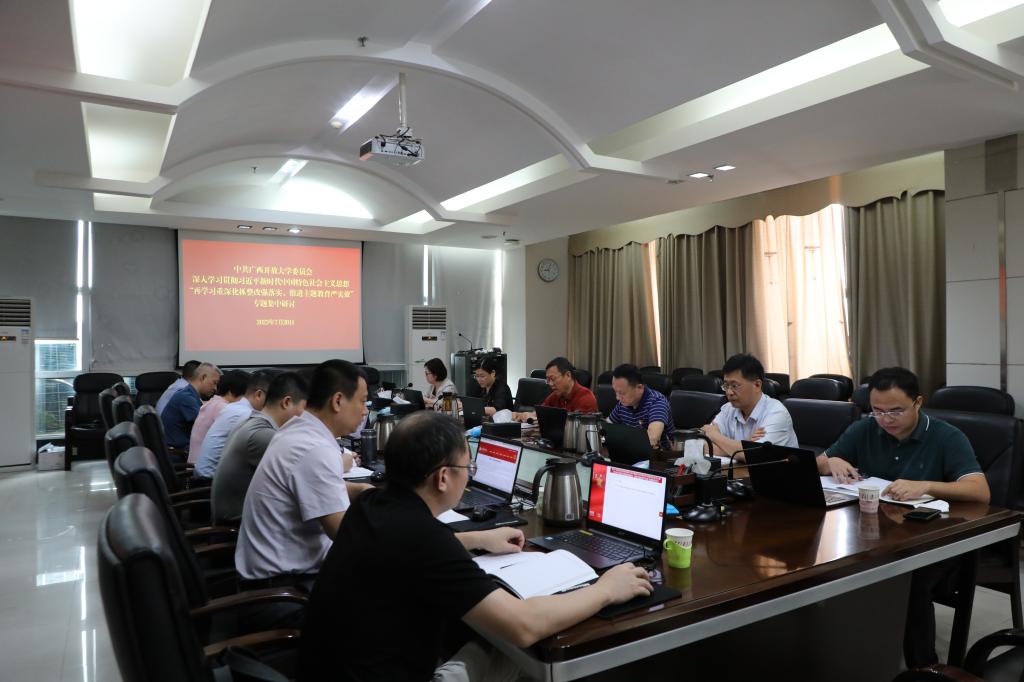 党委宣传部 报道 7月19日至20日,星空网页版登录入口党委组织全体党委委员、校领导以及广西信息职业技术学院院领导,在远教大厦16楼会议室开展深入学习贯彻习近平新时代中国特色社会主义思想“再学习重深化抓整改强落实,推进主题教育严实效”专题学习集中研讨。